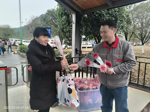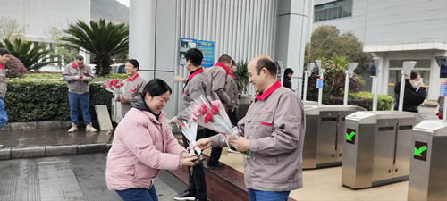 3月8日清晨,公司男領導們早早守候在公司一道門、二道門、南門入口處為每一位上班的女職工送上嬌艷欲滴的鮮花和節日的祝福。一束束鮮花,一張張笑臉,構成了清晨最美麗的風景線。